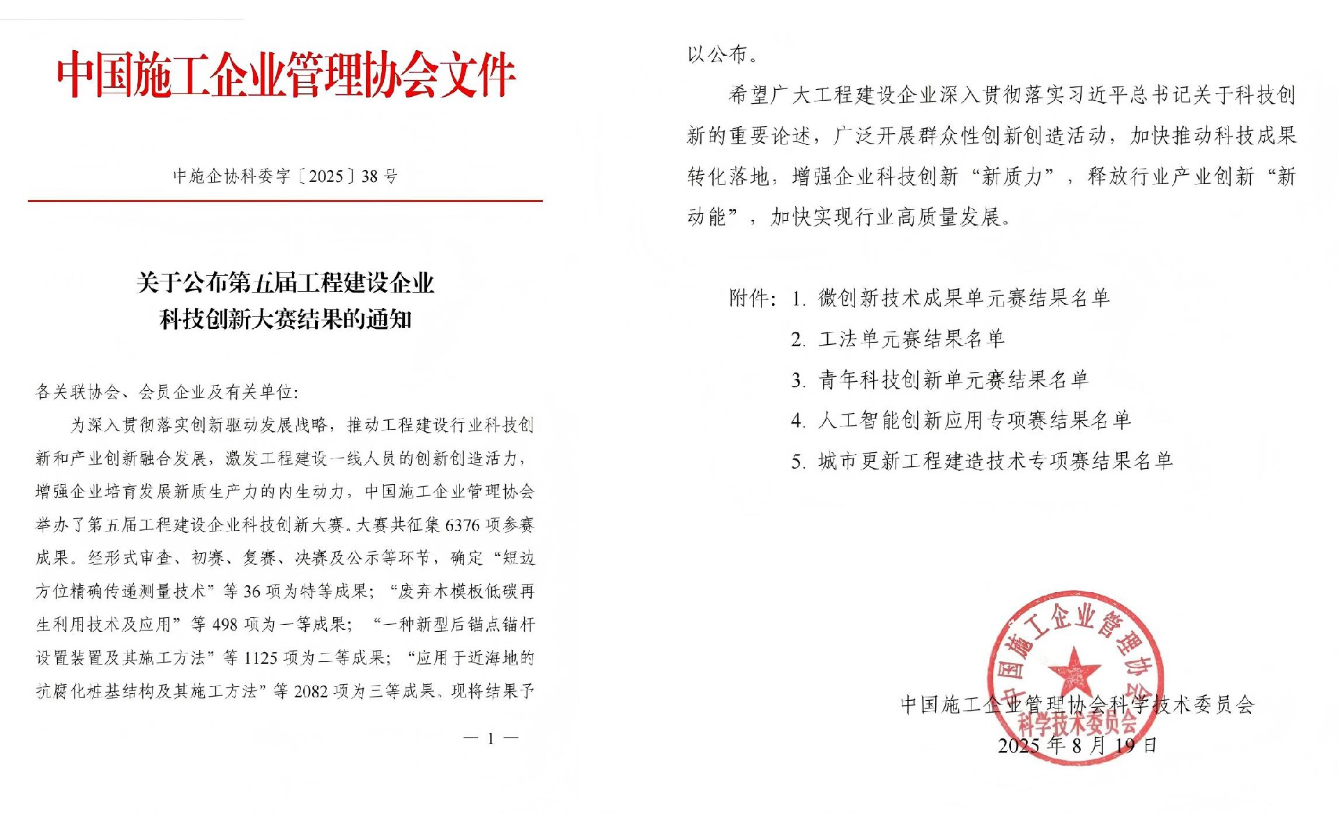 近日,第五屆全國工程建設企業科技創新大賽獲獎結果出爐,集團在“青年科技創新單元賽”中斬獲一等成果,在“工法單元賽”中獲得二等工法2項, 三等工法1項。···